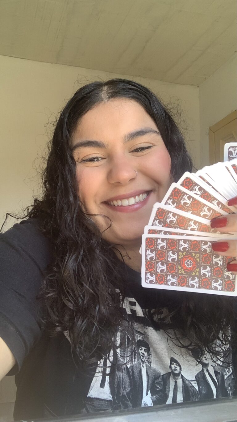 Sou cartomante desde 2021, professora de inglês e extremamente apaixonada por música. Gosto muito de estar em contato com a natureza e apreciar os momentos bons da vida. Minha trajetória na cartomancia iniciou bem antes na minha família, e eu estou continuando esse legado maravilhoso unindo estudos, intuição e herança familiar e religiosa. Atualmente trabalho com as cartas de forma virtual mas pretendo ter meu espaço físico um dia!
